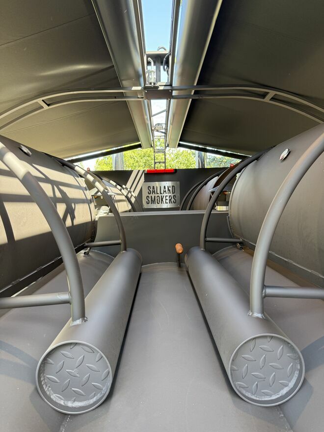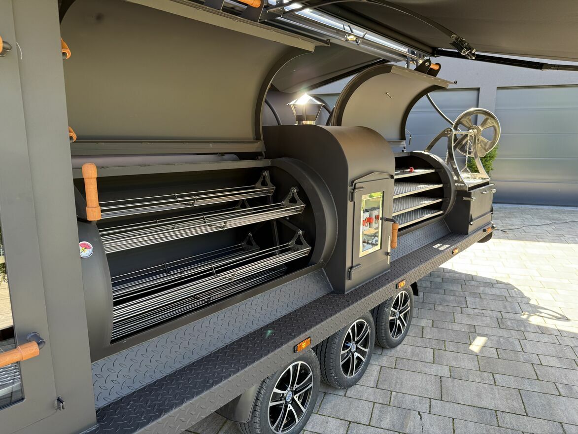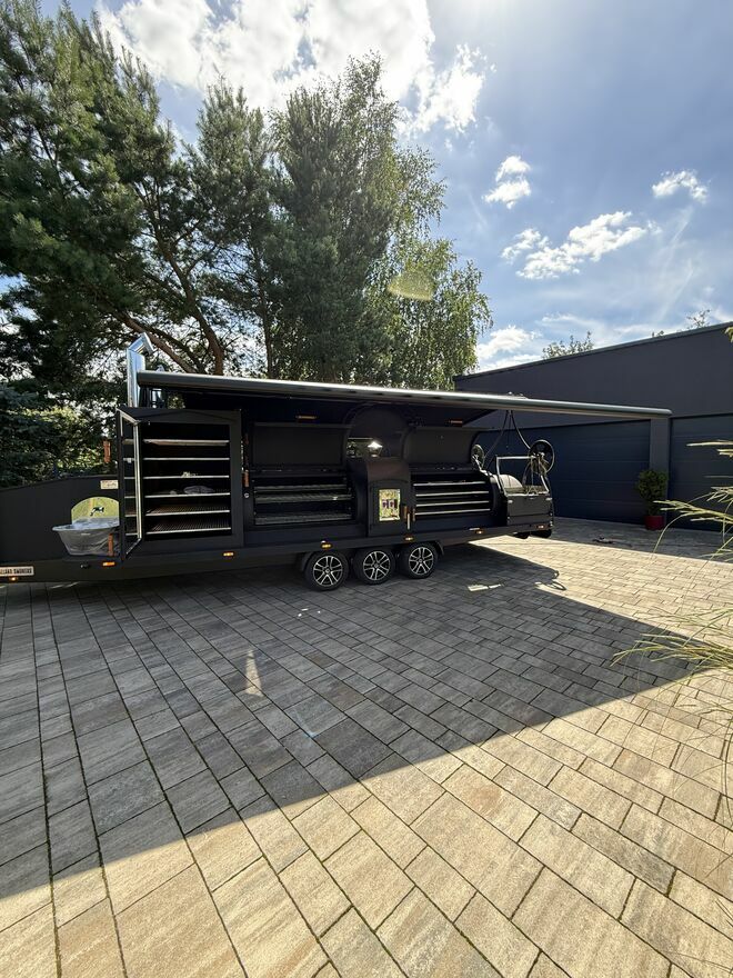 Grill na przyczepie Bez wątpienia to największe tego typu urządzenia w Polsce, zbudowane na trzyosiowej blisko 9 m platformie . Wyposażony w dwie podświetlane komory BBQ o powierzchni roboczej 5,6m2 z możliwością jednoczesnego pieczenia dwóch tuszy dzika lub prosiaka, dwie podświetlane komory grilla węglowego o powierzchni 2,8 m2, dwie wędzarnie o łącznej powierzchni roboczej 12m2 . Ten gigant posiada 20m2 powierzchni roboczej . Do ogrzania tej powierzchni zbudowano palenisko o pojemności 1 m3 z nadmuchowym systemem kontroli temperatury w komorach BBQ i wędzarni. Wyposażony w zasobnik na wodę o pojemności 200 litrów ,dwa zlewy z ciepłą i zimna wodą. Podręczne stoły robocze o powierzchni 2m2 składane na czas podróży. Zasobnik do drewno o pojemności 1,5m3 ,a całość zadaszona dwiema markizami o łącznej powierzchni 23 m3.Zdjęcia prezentowane nie przedstawiają wersji podstawowej. Urządzenie na zamówienie.